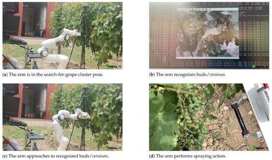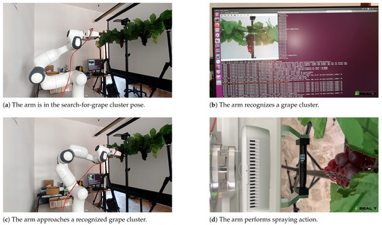 The spraying workflow described at the beginning of Section 4.3.1 is relatively straightforward. Once the vision system recognizes a bunch to be treated, the corresponding bounding box is sent to the robotic orchestrator, which, in turn, determines the target pose of the arm based on the centroid of the bounding box itself. Based on this premise, it seems legitimate to assume that there is a direct correlation between the performances of the vision system and the performance of the actual administration: