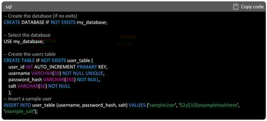 Initially, the code checks if a database named “my_database” exists, creating it if not. Then, the code selects this database for subsequent operations. A table named “users” is created if it does not already exist, defining its structure to store user information, including a unique identifier (user_id), non-null and unique username, password hash, and salt value. A sample user is inserted into the “users” table with simulated values. A comment notes that the password has been hashed and salted in PHP, highlighting the importance of securely storing passwords. Additionally, the code provides commented PHP lines exemplifying how to verify a password. This code snippet demonstrates database setup, table creation, and password handling practices in a secure manner. Figure 2 highlights the syntax for better understanding, where a blue color is used to easily recognize the SQL keywords (e.g., create, if not exists, or primary key). Additionally, comments in both SQL and PHP, denoted by -- in SQL and // in PHP, are displayed in a gray color, to clearly distinguish them from the executable code. Moreover, specific values, including database names (my_database), table names (users), column names (user_id, username, etc.) and data types (VARCHAR, INT, etc.) are presented in black or purple colors, for clarity and differentiation within the code structure.