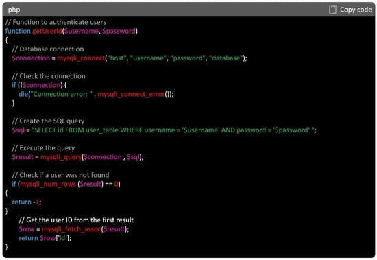 Figure 3 shows a representative example of a PHP code that defines a function named “getUserId”, designed for user authentication in the SQL database. The PHP code was generated by ChatGPT based on the following prompt: