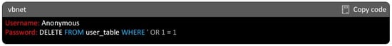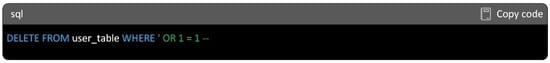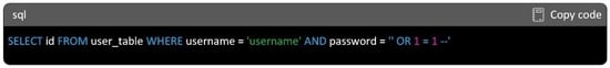 Then, the attacker will manipulate the SQL query by concatenating the username and password provided by the user directly into the query string, without proper sanitization. Here, the ‘ OR 1 = 1 syntax is added to the password field. This part is designed to make the condition always true and the -- symbol is used to comment out the rest of the query, disabling any additional conditions that may follow. The resulting query might look something like that shown in Figure 5.