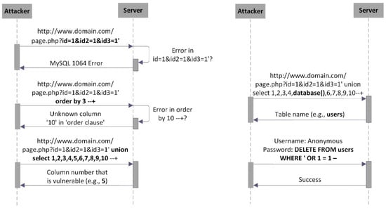 Figure 7 summarizes the SQL injection attack. The key actors in this scenario include the hacker, responsible for carrying out the attack; the website at the server, which serves as the destination; and the database, where sensitive information is stored. The attack phases include reconnaissance, during which the attacker gathers information about the website and database; crafting the malicious request, designed to exploit a vulnerability in the database; sending the malicious request to the website; exploiting the vulnerability within the database; and, finally, extracting the sensitive data from the website.