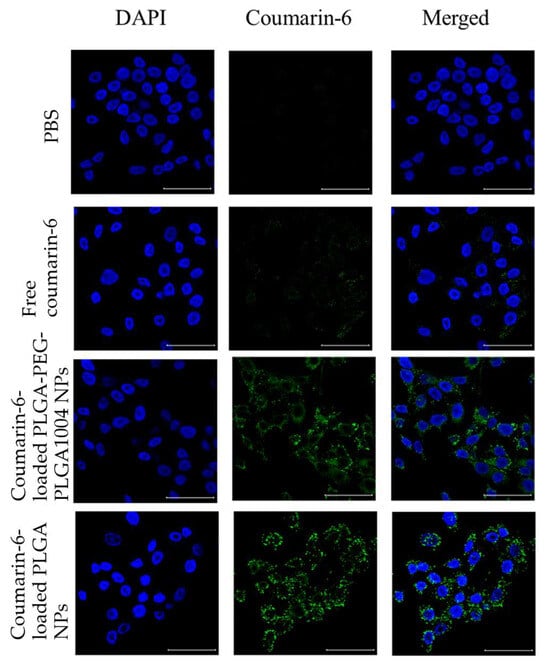 Fluorescent images of cellular uptake tests of control (PBS), free-coumarin-6, coumarin-6-loaded PLGA-PEG-PLGA1004 NPs, and coumarin-6-loaded PLGA NPs using a confocal laser scanning microscope. The left column, the DAPI channel, shows blue fluorescence, the middle column, the coumarin-6 channel, shows green fluorescence from the nanoparticles, and the right column represents the DAPI and coumarin-6 channels, merged (scare bar: 50 μm) [20].