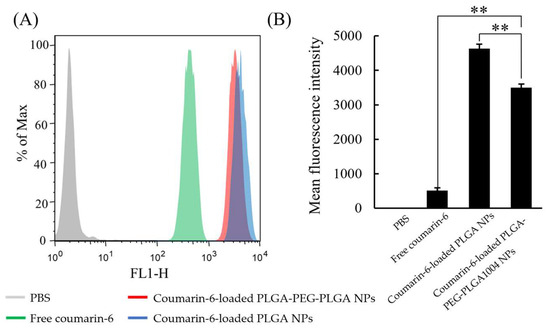 FACS measurement results (A) and mean fluorescence intensity (B) of control (PBS), free-coumarin-6, coumarin-6-loaded PLGA-PEG-PLGA1004 NPs, and coumarin-6-loaded PLGA NPs (mean ± S.D., n = 4, ** p < 0.01, Tukey’s test).