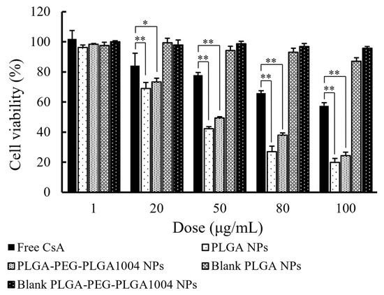 Cell viability of HaCaT cells after 24 h, measured using MTT assay (mean ± S.D., n = 4, * p < 0.05, ** p < 0.01, Tukey’s test). Blank PLGA NPs and blank PLGA-PEG-PLGA NPs refer to PLGA NPs and PLGA-PEG-PLGA NPs without CsA, respectively.