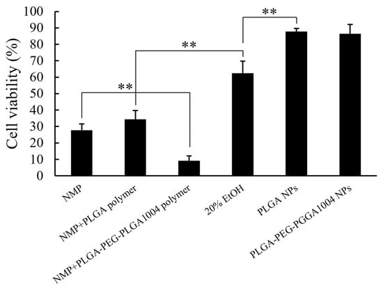 Reducing skin irritation is an important issue in formulations applied to the skin, especially in formulations containing low-molecular-weight compounds, to promote transdermal absorption [23]. The NMP used for the preparation of NPs has also been used as an absorption enhancer in transdermal administration [24]. Therefore, we investigated the skin irritation caused by PLGA-PEG-PLGA1004 NPs using LabCyte CORNEA-MODEL (Japan Tissue Engineering Co., Ltd., Gamagori, Japan), a human three-dimensional cultured corneal epithelial model. Experimental operations were performed in accordance with the attached manual. NMP containing 2.67% (w/v) PLGA, NMP containing 2.67% (w/v) PLGA-PEG-PLGA1004, 20% (v/v) ethanol solution (20% EtOH), PLGA NPs, and PLGA-PEG-PLGA1004 NPs were tested, and the cell viability of each was evaluated using an MTT assay. The cell viability was calculated using the following formula:
