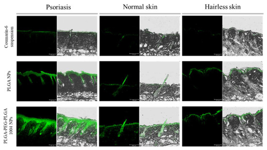 Confocal laser microscope images of cross-sections of mouse skin with the coumarin-6 suspension, PLGA NPs, and PLGA-PEG-PLGA1004 NPs at 24 h from the initiation of the ex vivo skin permeability tests (scale bar: 100 μm). The green fluorescence comes from coumarin-6. Mouse skin was collected from the psoriasis model mouse (psoriasis skin), BALB/cCrSlc mouse (normal skin), and KSN/Slc mouse (hairless skin).