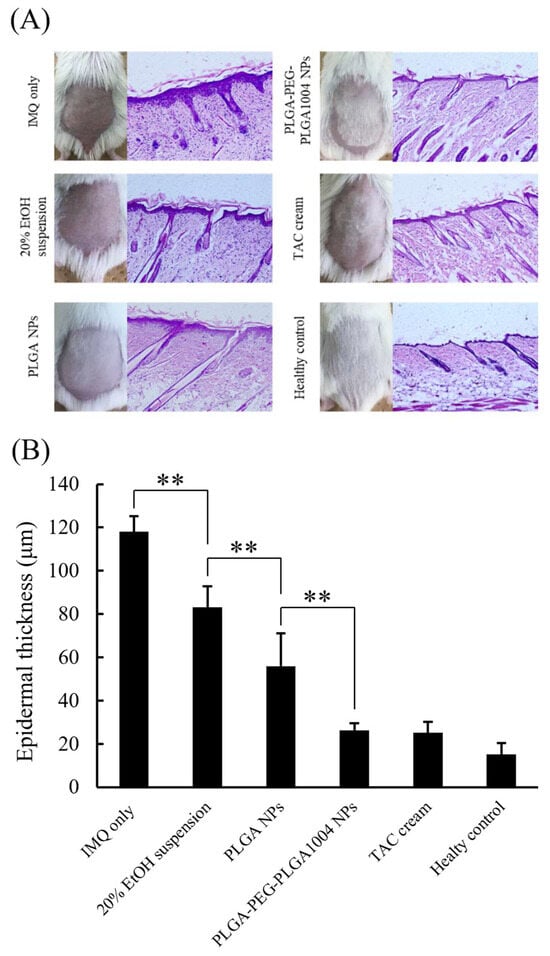 Animals were divided into six groups of five mice each: SHAM (healthy control), untreated (negative control), 20% EtOH suspension, TAC cream (positive control), PLGA NPs, and PLGA-PEG-PLGA1004 NPs. Mice in groups other than the SHAM group had 62.5 mg of IMQ cream applied to their shaved dorsal skin for 14 consecutive days starting from day 0. In the treatment group, from day 7 onwards, each sample was applied 12 h after applying the IMQ cream. To evaluate the therapeutic effects, animals were euthanized by anesthesia on day 16, and the skin and spleen were collected [26,27]. After treatment, the skin was fixed and embedded in a manner like that previously reported [11]. Skin sections sliced to a thickness of 10 μm using a cryostat (CM3050S, Leica Instruments, Nussloch, Germany) were stained with hematoxylin and eosin and then observed using a fluorescence microscope (BZ-9000; Keyence, Osaka, Japan). The epidermal thickness of each group was randomly selected 15–20 times and measured using ImageJ Fiji software [28,29,30]. Cytokine levels in the skin of each group were quantified using ELISA. The collected skin was homogenized in extract solution (10 mM Tris pH 7.4, 150 nM NaCl, 1% Triton X-100) [31], and then centrifuged to remove solids. The amounts of TNF-α, IL-22, and IL-17A in the obtained supernatant were quantified using LEGEND MAX™ Mouse TNF-α ELISA Kit, LEGEND MAX™ Mouse IL-22 ELISA Kit, and LEGEND MAX™ Mouse IL-17A ELISA Kit (BioLegend Inc., San Diego, CA, USA). We also estimated the immunosuppressive effect of CsA by calculating the spleen/body wt% from the weight of spleens removed from mice in each group after the end of the treatment experiment. The spleen is an important organ in the immune system, and the weight of the spleen is significantly involved in the immune response [32].