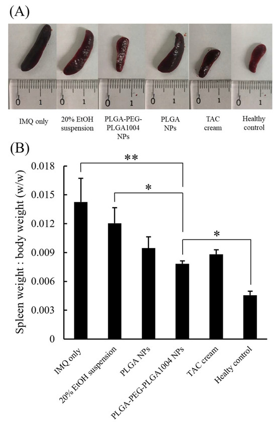 Images of skin sections stained with hematoxylin and eosin and numerical values of epidermal thickness for each group are shown in Figure 6A,B, respectively. Compared with that in the untreated group (“IMQ only” in Figure 6), the thickness of the epidermal layer in the treated group decreased, which confirmed that epidermal thickening was suppressed. PLGA-PEG-PLGA1004 NPs showed high therapeutic efficacy, and their efficacy was comparable to that of TAC cream (Figure 6B). Figure 7 shows images of the spleen and the spleen/body ratio (w/w) after the end of the treatment. The increased spleen weight in the untreated group suggested that IMQ application caused an excessive production of inflammatory cytokines and immune cells. It was shown that PLGA-PEG-PLGA1004 NPs significantly suppressed the increase in spleen weight, indicating that PLGA-PEG-PLGA1004 NPs exerted a high effect on inflammatory induction.