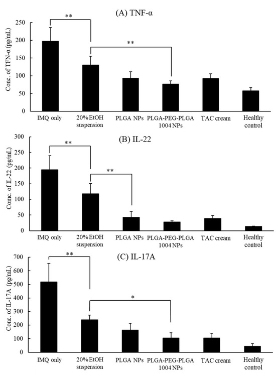 Figure 8 shows the produced amounts of TNF-α, IL-17A, and IL-22 in each group. They were increased in the untreated group, indicating that IMQ induces cytokines related to psoriasis. From the results in Figure 8, it was confirmed that PLGA-PEG-PLGA1004 NPs had a therapeutic effect equal to or greater than that of TAC cream. In the PLGA-PEG-PLGA NP administration group, all cytokine levels were significantly lower than those in the 20% EtOH suspension administration group. Moreover, those values tended to be lower than the values in other treatment groups. These indicate that the skin permeability of NPs influences the therapeutic efficacy of CsA.