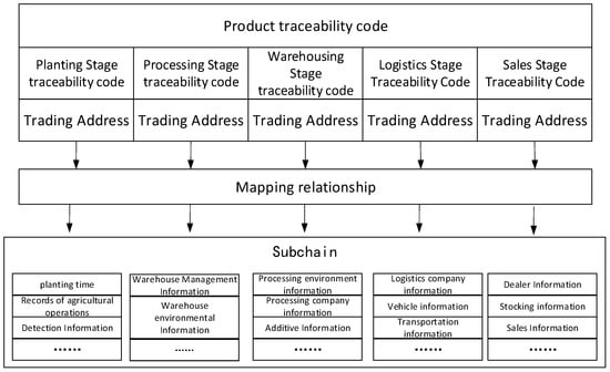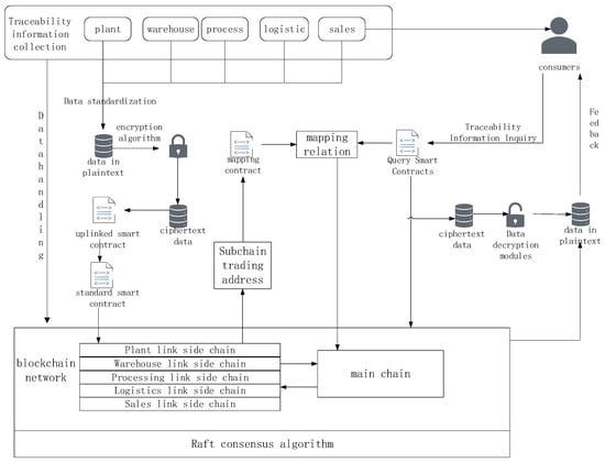 After information is collected, the traceability information is divided into public traceability data and private traceability data through the on-chain contract. The private traceability data are encrypted by RSA algorithm, and then the ciphertext data are uplinked to the corresponding side chain, while the public traceability data are directly uplinked after the quality and safety standard monitoring smart contract. Through the side chain uplinking contract, the hash address of the transaction and the link traceability code of the link are returned to the link node, and the node establishes the mapping relationship between the traceability code and each transaction by calling up the mapping contract and then saves the mapping relationship on the main chain.