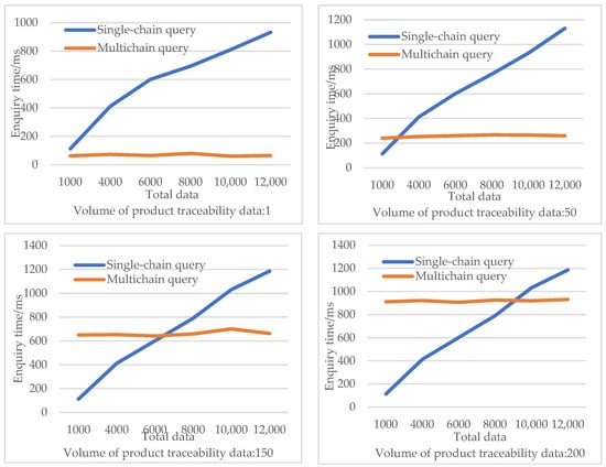 In order to compare the query efficiency of the multi-chain model with that of the single-chain model, a validation data query time-consuming experiment is designed. Sets consisting of 1000, 4000, 6000, 8000, 10,000 and 12,000 datapoints were prepared to test the time required to query 1, 50, 150 and 200 pieces of traceability data, respectively. The results of the experimental data comparison are shown in Figure 4.