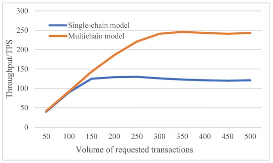 TPS refers to the number of transactions that the system can process per second, which is one of the important indicators of blockchain system performance. The multi-chain traceability model is tested in comparison with the traditional single-chain blockchain structure to test the throughput of the two storage structures when sending 50, 100, 150, 200, 250, 300, 350, 400, 450, and 500 requests, respectively, under the same test environment, where the requests sent are data query requests. The test results are shown in Figure 5.
