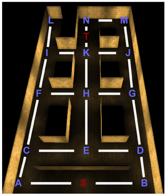 For the experiments, we utilized Unreal Tournament, a First-Person Shooter (FPS) video game that enables developers to configure environments and program bot logic before deploying them into the virtual world. We employed Unreal Editor [19] to craft the test scenario, comprising a series of interconnected traversable corridors, as shown in Figure 1, to ensure access to any point of interest in the map through seven distinct paths: