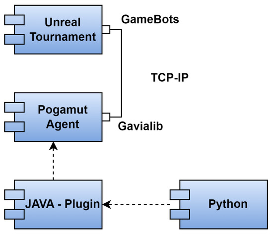 Pogamut is a crucial component that ensures seamless agent interaction within the virtual environment. It serves as a middleware, empowering virtual agents’ control across various environments game engines offer. Pogamut provides a Java API to generate and manage virtual agents and a user-friendly graphical interface for streamlined debugging purposes [20]. The architectural model facilitating the integration of CBOT with the virtual environment via Pogamut is illustrated in Figure 2.