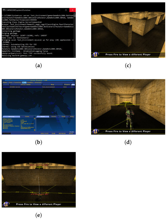 The sequence of actions during the match execution is as follows: first, we executed the server responsible for loading the designated test environment (Figure 3a). Then, UT2004 was connected to this server (Figure 3b), resulting in the appearance of the empty test scenario (Figure 3c). Subsequently, we launched GBOT (Guard Bot) and EBOT (Explorer Bot) from Eclipse into the virtual environment. Figure 3d,e depict the views of CBOT and GBOT, respectively.