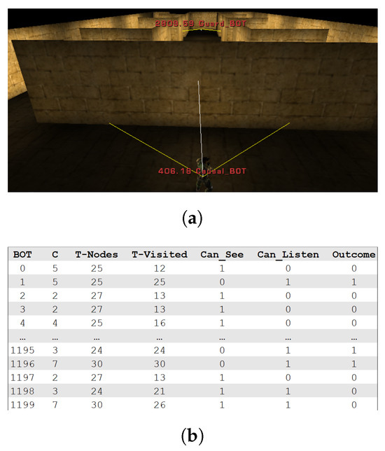 Figure 4a depicts the starting positions of the agents in the virtual environment at the beginning of a match. Additionally, Figure 4b provides a snapshot of the dataset generated during one of these matches.