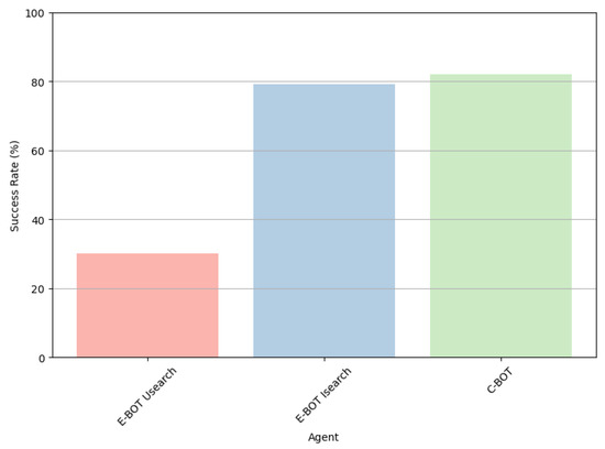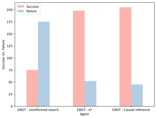 As expected, the EBOT with the uninformed search algorithm performed poorly compared to others in Figure 7. The CBOT narrowly outperformed the EBOT with A*, primarily because the latter’s heuristic calculation included a penalty for being detected while calculating the path, considering it a failure. However, this EBOT’s behavior was based on a heuristic calculation that did not consider causal elements.