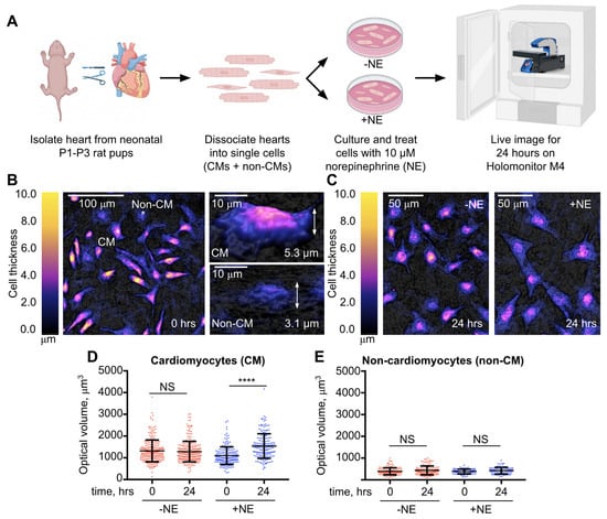Quantification of cardiomyocyte optical volumes in response to 24 h stimulation with 10 µM norepinephrine. (A) Overview of experimental design. Cardiac cultures derived from the hearts of postnatal day 1 (P1) to P3 rat pups cultured with and without 10 µM norepinephrine (NE) treatment and then visualized for 24 h on the Holomonitor M4 digital holographic imaging microscope. (B) Representative three-dimensional reconstructions of cultured cardiomyocytes (CM) and non-cardiomyocytes (non-CM) as visualized on the Holomonitor M4 at the beginning of our time-lapse imaging experiments at 0 h (0 hours). CMs were identified based on their larger size and overall thickness. (C) Representative three-dimensional reconstructions of cultured CMs untreated or stimulated with 10 µM NE at the end of our time-lapse imaging experiments (24 h). NE-treated CMs exhibited dramatic changes in morphology including spreading and the development of protrusions. (D) Measured optical volumes of untreated (n = 256) and NE-stimulated (n = 187) CMs at 0 h and 24 h of live-imaging on the Holomonitor M4 quantified from 4 independent cardiac cultures derived from P1–P3 rat hearts. (E) Measured optical volumes of untreated (n = 140) and NE-stimulated (n = 90) non-CMs at 0 and 24 h of live-imaging on the Holomonitor M4 quantified from 3 independent cardiac cultures derived from P1-P3 rat hearts. Values are reported as mean ± standard deviation. One-way ANOVA, Tukey’s multiple comparisons test; ****, p < 0.0001; NS, not significant.