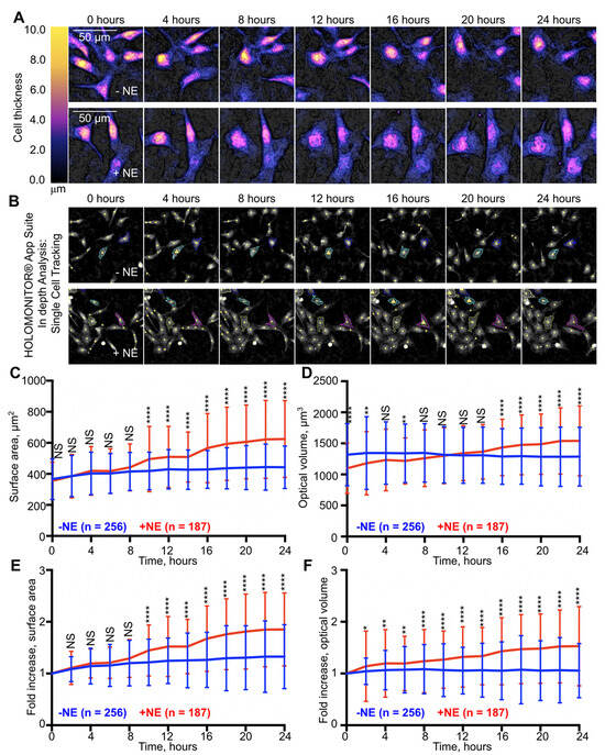 Single–cell tracking of cardiomyocyte surface area and optical volume dynamics during 24 h treatment with 10 mM norepinephrine. (A) Representative panels of three-dimensional reconstructions of cultured cardiomyocytes (CM) untreated or stimulated with 10 µM norepinephrine (NE) over 24 h of live imaging. (B) Representative panels depicting image segmentation and identification of well-isolated CMs using the HOLOMONITOR App Suite software and the Single Cell Tracking module. Drastic changes in cell volumes are flagged by the software (yellow triangles containing exclamation points) to assist with the validity of cell identification tracking. Raw surface area (C) and optical volume (D) dynamics of untreated (n = 256) and NE-stimulated (n = 187) cells over the course of 24 h imaging. Normalized surface area (E) and optical volume (F) dynamics were determined by dividing the value obtained at each time point by the initial value measured in cells at the start of the imaging experiment (0 h). Cellular measurements are pooled from the analysis of cultures from 4 independent cardiac culture preparations from P1–P3 rat hearts. Multiple t-test analysis was performed to determine statistical difference between untreated and NE-stimulated cells at each time point using the two-stage step-up method of Benjamini, Krieger, and Yekutieli with FDR set at 1%: *, p < 0.05; **, p < 0.01; ****, p < 0.0001; NS, not significant.
