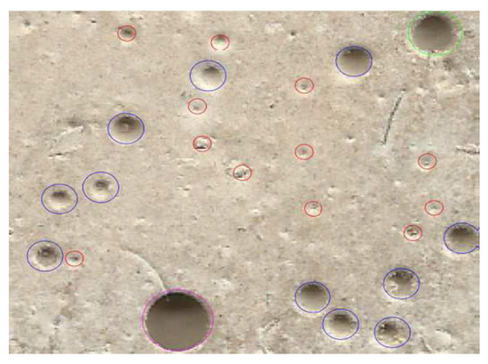 Characterizing the quality of a concrete surface is a major problem for the concrete industry. Surface quality varies depending on the application envisaged for concrete. The surface needs to be not only visually appealing but also structurally sound. Quantifying surface defects is essential for ensuring material quality and durability, and it is equally crucial to understand how these surfaces initially form and how they may be altered. Surfaces may indeed evolve freely during their solidification, but they may also incur damage, or they may take on a closed shape due to the wall effect when in contact with formwork [1,2]. In assessing the severity of surface defects in concrete, it becomes evident that the gravity of these imperfections is not solely determined by the area that they occupy on the surface but also by their depth. Deeper defects can have a more profound impact on the structural integrity and performance of concrete [3,4]. Additionally, the depth of defects can influence their potential to accumulate contaminants and facilitate the growth of microorganisms that might compromise the material’s long-term durability [5,6]. Therefore, for aesthetic and functional considerations, the combination of both surface area and depth provides an objective assessment of concrete surface quality. Surface quality evaluation tends to be subjective and, hence, more difficult, as current specifications allow for visual evaluation, which can lead to disagreements in the detection and evaluation results [7]. The primary quality inspection methods for concrete surfaces are based on manual inspection—size measurement, counting, and classification of bugholes on the surface of concrete [8,9,10]. The Quality Surface Index (QSI) serves as an illustrative example of a simplified method for evaluating the surface area occupied by pores. This approach, as depicted in Figure 1, which provides a visual representation of this surface evaluation method, involves analyzing pore groups based on their diameter [11]. The sand patch method, according to Kaufmann, involves a pre-defined amount of sand to be applied on the surface to be measured, and it is distributed evenly in circular movements [12].