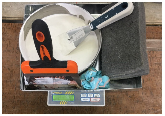 The procedure employed in the SDI method involved several basic phases. Firstly, before each operation, it was necessary to prepare the tested surface to ensure the perfect penetration of the ready-mixed plaster (RMP). This initial phase involved cleaning the surface by brushing to remove all pulverulent compounds contained in the surface parts. Next, a tray comprising a receptacle containing the RMP and tools needed for the handling process (scraper, cloth) was weighed (Mt before), as shown in Figure 4.