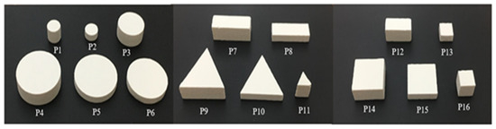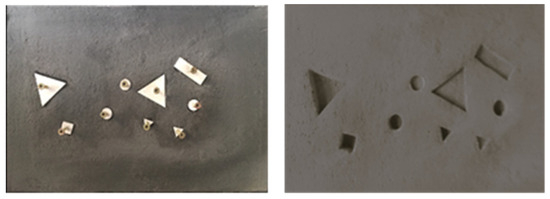 Theoretically, this method is capable of quantifying concrete surface defects. The test samples needed to be prepared according to the study’s specifications. To obtain repeatability and reproducibility parameters, a series of four (27.5 × 17 × 2.5 surface specimens were manufactured using plaster. Plaster is a material with an imprint; it is dimensionally stable and offers high precision, as well as detailed definition. Due to the variety of surface defects encountered, the validation of the method would require adaptation to each level of surface defects and evaluation in a case-by-case study. In order to present different surface defects that can affect the appearance, functionality, and durability of structures, surface specimens on which defects with known characteristics were reproduced were manufactured. Defects on specimen surfaces can be defined as ideal in the sense that they are regular and perfectly clean geometric indications. For this purpose, fifteen types of forex texturing patterns with different shapes, sizes, and depths were manufactured, as shown in Figure 6. These patterns were used to create defects on the surface of the molded specimens with well-defined volumes, as shown in Table 2. Each printed defect presented specific characteristics, such as its shape, size, and depth. These features were carefully chosen to ensure a variety of defect configurations that could be studied and evaluated as part of this research.