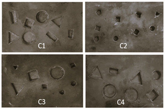 Figure 8 shows the appearance of the four surface configurations: C1, C2, C3, and C4. Each surface sample had a specific configuration that encompassed defects of various sizes, lengths, depths, and shapes, covering a wide range of scenarios corresponding to one of the configurations mentioned above. The four configurations reflected the expected variability under the conditions of repeatability and reproducibility and were adapted to the measurements to be made.