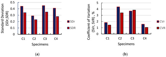 The measured ready-mixed plaster masses for each sample were investigated as quantitative variables. These variables are represented as the mean (M), standard deviation for repeatability (SDr), and standard deviation for reproducibility (SDR), along with the corresponding coefficients of variation in repeatability and reproducibility (CVr% and CVR%). First, repeatability (within-operator variance) and repeatability variance was assessed as follows: an operator performed four repeated measurements on the same specimen. This represented the variation due to repeated measurements by the same operator on the same specimen.