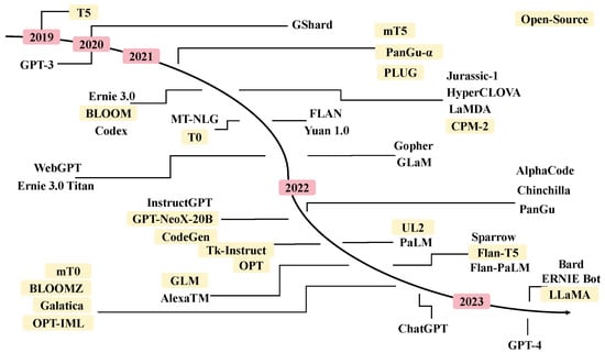 The depiction illustrates the development trajectory of Large Language Models (LLMs) from 2019 to 2023, meticulously documenting the introduction of significant models and technologies during this period. This includes the launch of models, from T5 and GPT-3 to the latest GPT-4, LLaMA, demonstrating the continual progress and evolution of large language models in the field of Natural Language Processing (NLP). Moreover, the illustration includes models optimized for specific domains and tasks, such as Codex, AlphaCode, reflecting the expansion and deepening of large language model technology in multiple directions.