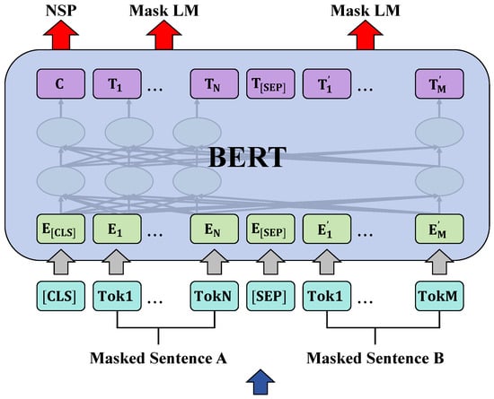 Here, Q, K, and V represent the matrices for Query, Key, and Value, respectively, with denoting the dimension of the key vectors. This formula calculates the output by computing the similarity between the queries and keys, then using these softmax scores to weight the values. By stacking multiple attention layers and incorporating feed-forward neural networks, residual connections, and layer normalization in each layer, Transformer models build deep architectures. The advantage of this architecture lies in its strong parallel processing capabilities, ability to capture long-distance dependencies, and flexible adjustment of model parameters through layer and width expansion. BERT (Bidirectional Encoder Representations from Transformers) is a Transformer-based model introduced by Google in 2018 [25], as shown in Figure 2.
