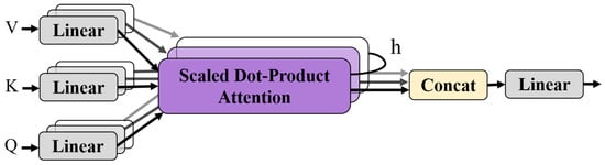 The depiction presents the core mechanism of the Transformer model structure with Scaled Dot-Product Attention. Detailed here is the flow of information through linear transformation layers, processing by the attention mechanism’s weighted sum, followed by concatenation and another linear layer, culminating in the transformation of the input information. This structure forms the basis for the Transformer model’s ability to capture the complex relationships between elements within a sequence.