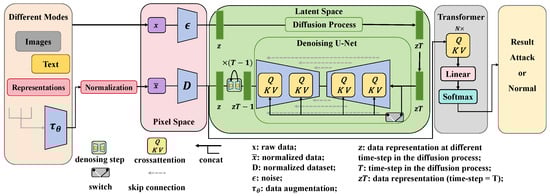 This figure displays an overall schematic of the model framework proposed in this paper, including the input processing of multimodal data, the application of the synchronized attention mechanism, and the integration of the denoising U-Net architecture. Initially, the raw data are enhanced (denoted as in the figure), then subjected to regularization and noise addition processes (represented by and in the figure), forming the model’s input. The noised data z undergo processing through the diffusion process to obtain (where T represents the time steps in the diffusion process); subsequently, data are processed through the U-Net network for T steps of denoising to yield ; finally, the regularized data and are fed into the transformer for classification to produce the final result, which is the model’s output.