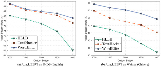 It can be observed that the success rate of all three attack methods decreases with decreasing query budget, with the change from 1500 to 1000 being more obvious. Taking the IMDB dataset as an example, HLBB exhibits the highest deterioration in attack success rate, reaching up to 7.7%. This can be attributed to its reliance on extensive random substitutions for searching adversarial examples instead of memorizing word importance. Consequently, it is only suitable for scenarios with loose query restrictions. TextHacker experiences a lower decline of 3.1% due to its ability to remember word importance using a weight table. However, because the weight table is randomly initialized, its accuracy decreases significantly when the query budget is strictly limited. WordBlitz demonstrates the most consistent performance, with only a marginal decrease of 1.9% in attack success rate compared to the other methods. Even under the strictly limited query budget (≤1000), it is able to achieves a remarkable success rate of 79.2%, which is due to the improvement in adversarial transferability with data augmentation. The experimental results on the Chinese Waimai dataset are similar, with the gap between the three methods being even more significant due to the broader search space of Chinese candidate pool, which requires high efficiency.