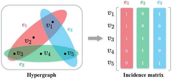 In addition, can also represent the possibility of assigning vertex v to hyperedge e or the importance of vertex v with respect to hyperedge e, using a range of [0,1] for representation. The relationship between the hypergraph and the incidence matrix is illustrated in Figure 1.
