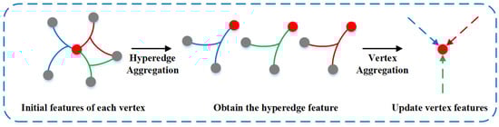In the process of hypergraph convolution, vertex features are transformed into hyperedge features, which are then converted into new vertex features as shown in Figure 2. Hypergraph neural networks include spectral domain-based methods [], where convolution uses a pre-defined hypergraph Laplacian matrix for vertex-to-vertex feature smoothing, and space-based methods [], where a two-stage message passing method (vertex-edge-vertex) is used, which is more flexible and can be easily extended to more types of higher-order structures, such as directed hypergraphs.