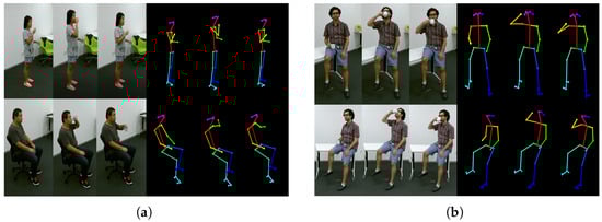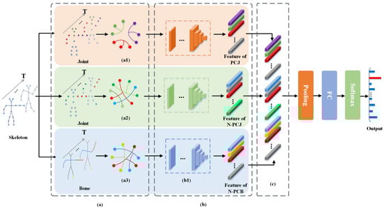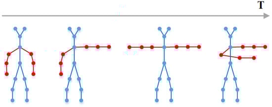 Action recognition [], a pivotal area within the realm of computer vision, has been extensively applied across various domains, including human–computer interaction [], virtual reality [], video surveillance [], and the field of autonomous driving []. Action recognition refers to analyzing and classifying human motion in specific environments. One important method is action recognition based on skeleton, where the skeleton sequence represents compact information on human motion as high-level information, providing an effective and robust representation form for describing human action. With the continuous development of 3D depth sensor technology, researchers can easily obtain the three-dimensional coordinates of human key joints, and thus obtain human skeleton data. Therefore, in recent years, more attention has been paid to some methods based on skeleton in the field of action recognition [,].
