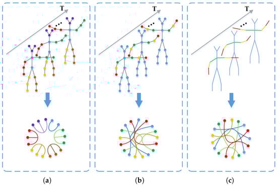 Visualization of different hypergraph constructions: (a) the construction of a physically connected joint spatio-temporal hypergraph; (b) the construction of a non-physically connected joint spatio-temporal hypergraph; (c) the construction of a non-physically connected bone spatio-temporal hypergraph.
