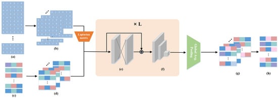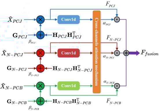 After obtaining the spatio-temporal features of each channel, the features , and of the three channels are adaptively fused by a multi-feature fusion module based on the cross-channel attention mechanism, which fully considers the complementarity among the data features of different channels. The structure of the module is shown in Figure 7.