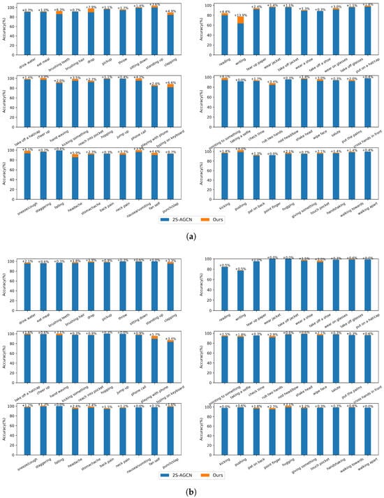 The NTU RGB+D 60 dataset contains common human actions such as drinking water, eating a meal, etc., and we analyze the accuracy of the action recognition for each category on this dataset. In order to visualize the improvement in the accuracy on different actions and to analyze the causes of misclassified actions, we plot bar charts based on the accuracy of 2S-AGCN and our proposed method on the NTU RGB+D 60 dataset for 60 action categories. As shown in Figure 9, the blue bars indicate the performance of 2S-AGCN, and the orange bars and the numbers on them indicate the performance improvement of our proposed method compared to using 2S-AGCN. Observation reveals that our proposed method has some performance improvement over 2S-AGCN for the vast majority of action categories. Figure 9a shows the CS (cross-subject) protocols of the NTU RGB+D 60 dataset. We can observe that the recognition accuracy of ‘write’ and ‘read’ is lower compared to other actions when using 2S-AGCN. For these two actions, the recognition accuracy is improved by about 13.9% and 4.4%, respectively, when using our proposed method. Figure 9b shows the CV (cross-view) protocols of the NTU RGB+D 60 dataset. We found that the recognition accuracy of some action, such as ‘writing’, ‘reading’, ‘playing with the phone’, and ’typing on keyboard’ is lower when using 2S-AGCN. The accuracy of action recognition is improved in all cases after using our proposed method. From the above experimental results, it can be seen that, compared to 2S-AGCN, there is a large performance improvement for actions such as ‘writing’, ‘reading’, etc., which only use part of the human body region. This is due to the fact that the proposed method can focus on regions with large variation and focus on the effective information of the action.