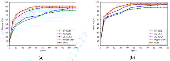 In addition, in order to comprehensively evaluate the model, it is necessary to consider not only the accuracy but also the convergence speed. To better demonstrate the comparative performance with other methods, we conducted accuracy tests on the NTU RGB+D 60 dataset using the CS (cross-subject) and CV (cross-view) protocols, and generated corresponding charts. As shown in Figure 10a,b, it can be observed that, as the number of epochs increases, all curves tend to reach their maximum values and stabilize. Our proposed method exhibits the fastest convergence speed, while Hyper-GNN, 2S-AGCN, AS-GCN, and ST-GCN show slower convergence rates. This indicates that our proposed network can achieve optimal results at the fastest speed compared to other methods.