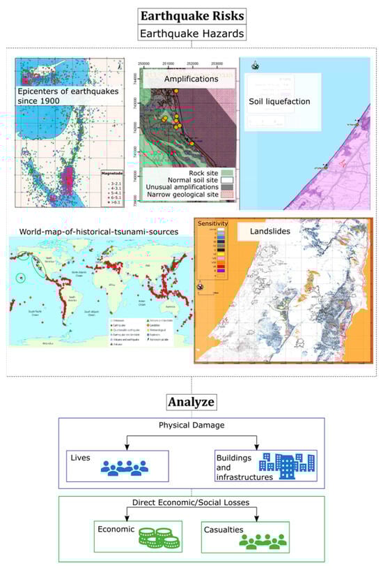 In seismic regions worldwide, seismological risks significantly threaten communities, critical infrastructures, and natural landscapes. This study specifically focuses on the Israeli region, highlighting the Great Rift Valley as a notable area of interest due to its significant seismic activity []. The Great Rift Valley is an expansive geological rift system from the Beqaa Valley in Lebanon to Mozambique in the south. It forms part of a larger system that encompasses both the Eastern and Western Rift Valleys, shaped by the gradual separation of the Earth’s crust, which leads to the creation of fault lines, escarpments, and profound valleys. Beyond its geological significance, the valley is notable for its rich biodiversity and crucial archaeological sites that provide insight into human evolution. This rift system presents a notable earthquake hazard to regions it traverses, including Israel. It influences a distinct movement pattern where the land east of the Jordan River shifts northward while the terrain to the west moves southward. These tectonic activities have progressed slowly, 5 to 10 mm per year over the last 10 to 20 million years. Although Israel is geographically situated in a region with low seismic activity, its history reveals several earthquakes that have resulted in considerable loss of life and damage to structures. The pattern of earthquake occurrence rates along a portion of the Great Rift Valley indicates that earthquakes with a magnitude of 6 and above, happening in and around Israel, align with a trajectory stretching from the Lebanon Valley to the southern Dead Sea. Figure 1, on the top left, displays a map to determine the epicenters of these earthquakes since 1900, categorized by their intensity. Furthermore, the Carmel Rift is another zone of notable seismic activity from the Carmel region to the Sea of Galilee.