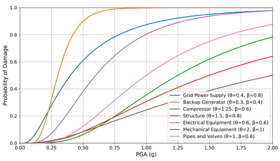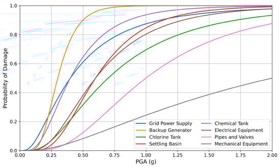 The water arriving at the facility is subjected to distillation and mineral removal processes. This treated water is then utilized to cool the turbines and compressors. The water treatment facility is constructed of a steel truss with a concrete slab foundation, with dimensions of 10 m in height, 60 m in length, and 23 m in width. Damage to the water treatment facility can result from a loss of electricity supply, damage to processing equipment (such as pumps, pipes, and membranes), and harm to chemical storage tanks. The primary subcomponents of the water treatment facility, along with their associated fragility curves, are detailed in Table 3 and depicted in Figure 3. The expected probability of damage for these subcomponents is calculated using the fragility curves for a PGA value of 0.05 g. The estimated probabilities are presented in the table.