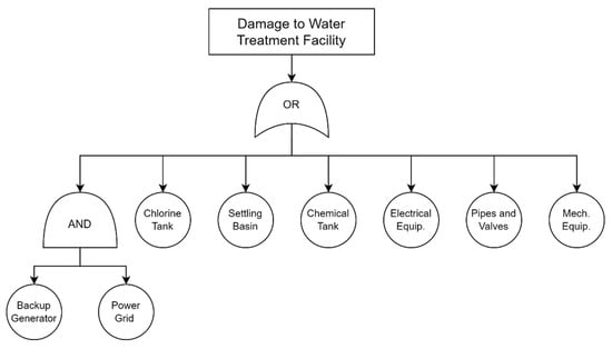 A Fault Tree Analysis (FTA) was conducted, utilizing the specified damage probabilities for each subcomponent. Figure 4 depicts the FTA, outlining potential failure mechanisms within the water treatment facility through “AND” and “OR” logic gates, reflecting the interdependencies among the subcomponents. The overall probability of damage to the facility was determined to be 0.231.