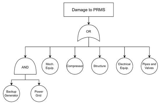 The Gas Pressure Regulating and Metering Station (PRMS) regulates and measures natural gas flow and pressure. Key components of a PRMS consist of inlet and outlet piping with associated valves, essential electrical and mechanical equipment, power sourced from the external grid complemented by a redundant backup generator, a compressor, and the encompassing structural framework. The parameters of the fragility curves for the PRMS’s subcomponents are detailed in Table 4, and the fragility curves are illustrated in Figure 5. Additionally, this table includes the expected probability of damage to these subcomponents. After conducting an FTA (Figure 6), the overall probability of PRMS failure was determined to be 0.082.