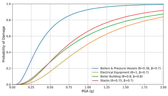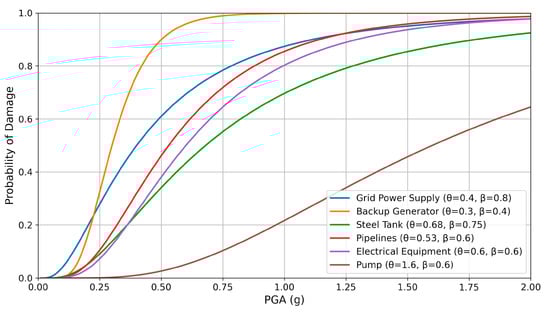 Components Vulnerability definition—fragility curve parameters are identified and associated with each essential component and subcomponent within the system. These parameters are typically obtained from established sources such as the Hazus technical manual [] and the FEMA database [] or previous research [,,]. However, in cases where suitable fragility curves are unavailable, this step may be supported by collaboration with structural engineers, alongside the utilization of historical damage data, empirical studies, and analytical models [,], or by the development of specific fragility curves [,].