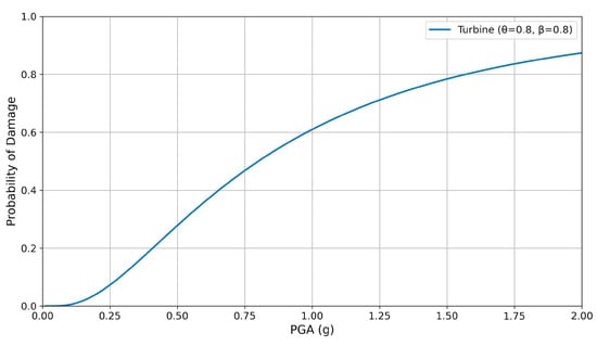 Gas-insulated switchgear (GIS) controls and isolates high-voltage electrical equipment within gas power stations, including generators, transformers, and transmission lines, ensuring efficient and safe power distribution. A failure in the switchgear station could include a structural failure (of the building) or a failure of the electrical equipment (switches, electrical panels, transformers, and generators). Figure 7 presents the fragility curves of the key subcomponents of the GIS, along with the fragility parameters. After conducting an FTA, the overall probability of GIS failure was determined to be 0.102.