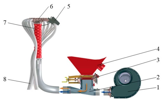 Pneumatic conveying seed system. 1. Fan; 2. seed–air mixing chamber; 3. centralized seeder; 4. seed box; 5. sensor 6. distributor; 7. pressurized tube; 8. seed conduit.