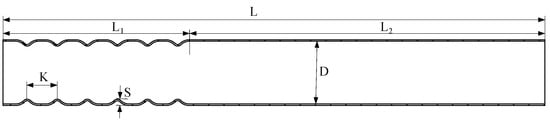The pressurized tube, a critical component connecting the seed–airflow mixing chamber and the distributor, plays a central role in improving the uniformity of seed distribution in the distributor. In this study, a corrugated pressurized tube was employed, as depicted in Figure 2. The main geometric parameters of this pressurized tube include the pressurized tube diameter (D), corrugation depth (S), corrugation width (K), and pressurized tube length (L). The pressurized tube is divided into two sections: a corrugated section (L1) with corrugations and a straight section (L2) without corrugations. By altering the geometric parameters of the pressurized tube, it is possible to modify the seed flow velocity and distribution within the pressurized tube. The use of numerical simulation techniques is an effective means to conserve processing costs and analyze seed migration trajectories.