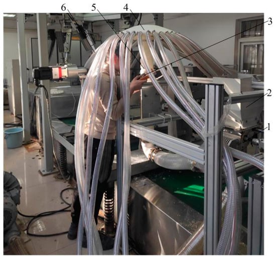 The experimental platform for the pneumatic seed delivery system was established based on the 2PST-type planter performance testing system at the National Key Laboratory of Soil–Plant Machinery System Technology, Chinese Academy of Agricultural Mechanization Sciences, as illustrated in Figure 3. The experimental setup incorporates an independent pneumatic seed delivery system. The platform utilizes a vortex-type air pump fan with a maximum speed of 2850 r/min, a maximum air pressure of 32 kPa, a maximum air volume of 9 m3/min, and a power of 5.5 kW. The inlet airflow velocity can be adjusted through a fan frequency converter, with a maximum frequency of 50 Hz. Seeds are discharged from the centralized planter and then enter the seed delivery system, with the seeding quantity controlled by adjusting the motor speed of the seed delivery shaft, where the motor’s maximum speed is 100 r/min.