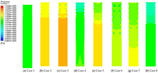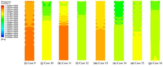 Pressure distribution contour plots within the pressurized tube for different structural configurations were obtained through post-processing using CFD-Post(14.0) software, as shown in Figure 5. In the straight segments of the pressurized tubes, the pressure distribution is uniform and pressure losses are relatively small, with consistent upper and lower pressure. When corrugations appear, pressure changes occur. The central pressure decreases, while the pressure at the pressurized tube wall increases. The depth of the corrugations affects the pressure changes, with deeper corrugations resulting in more pronounced pressure variations. Pressure losses within the pressurized tube also increase with longer pressurized tube lengths and a higher number of corrugations. As corrugation width increases, the pressure changes within the corrugated section first decrease and then increase.